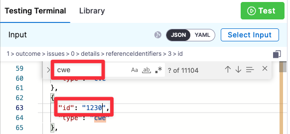 • A security test cannot include any issues in a list of reference IDs such as CWE-78 or CVE-2023-52138.
