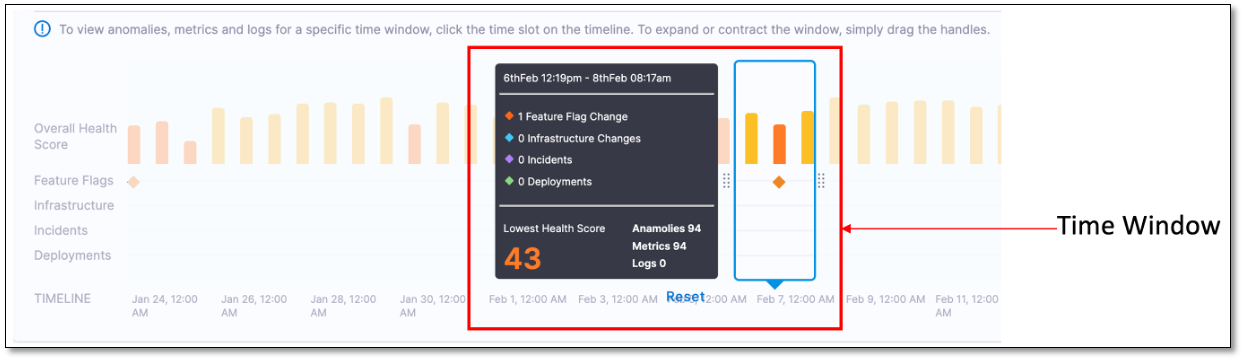 The Overall Health Score timeline has a time window that displays granular details such as health score, incident count, metrics, and logs for a specific time period on the graph. You can move the time window along the graph to choose a specific time period. You can change the time period by using the handles.