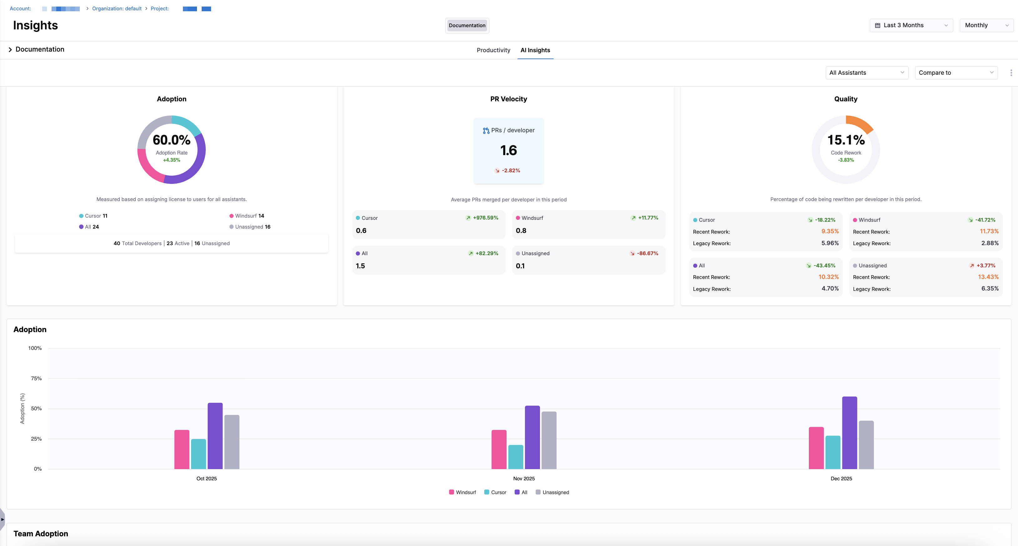 Adoption is measured based on license assignment to developers for each AI assistant. Developers are categorized as Cursor, Windsurf, All, or Unassigned depending on their assigned licenses during the selected time period.