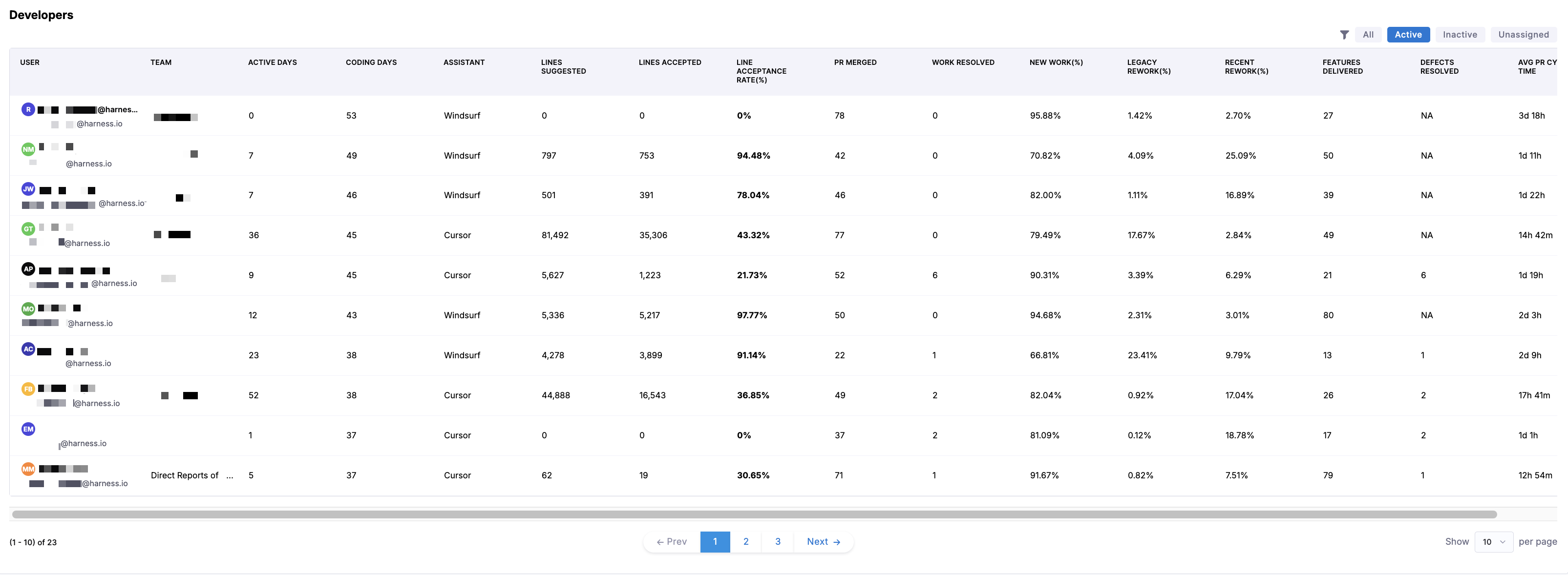 You can click the fields next to the Funnel icon to filter the table by All, Active, Inactive, and Unassigned and view a specific subset of developers and their activity.