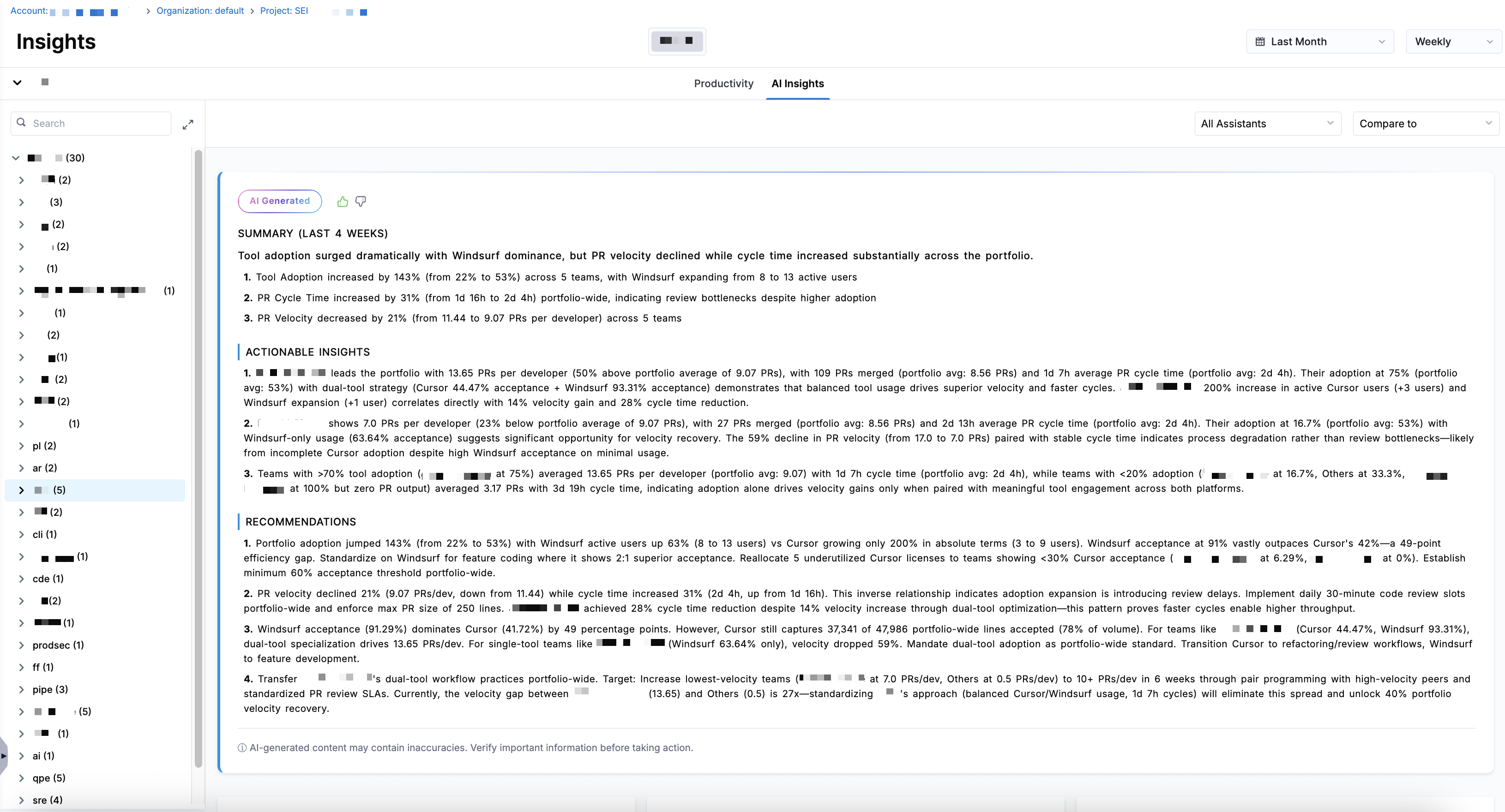 • Team-level summaries: Click on a team in the Org Tree on the left. The AI Summary updates automatically to reflect that team's adoption patterns, productivity trends, and code quality signals, allowing you to identify team-specific bottlenecks or high-performing code review workflows.