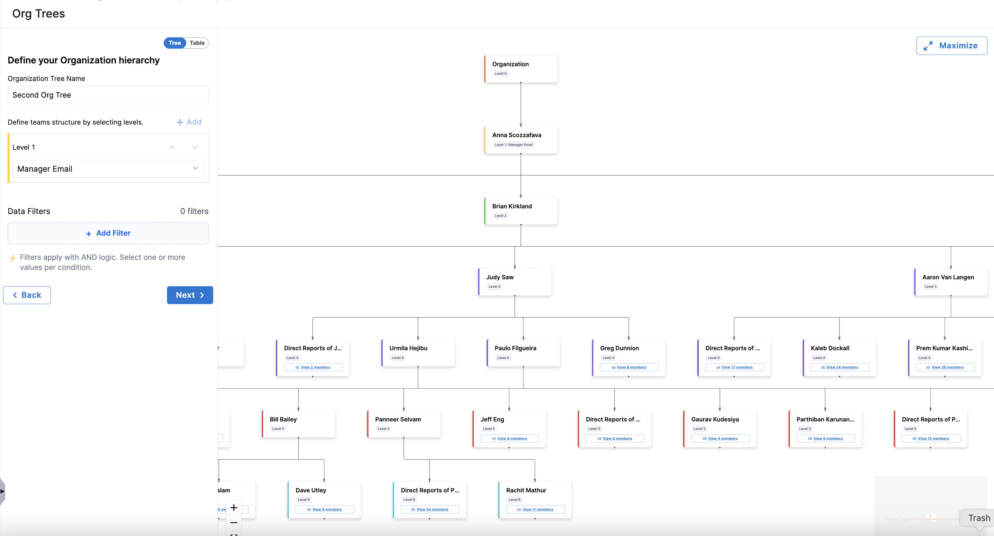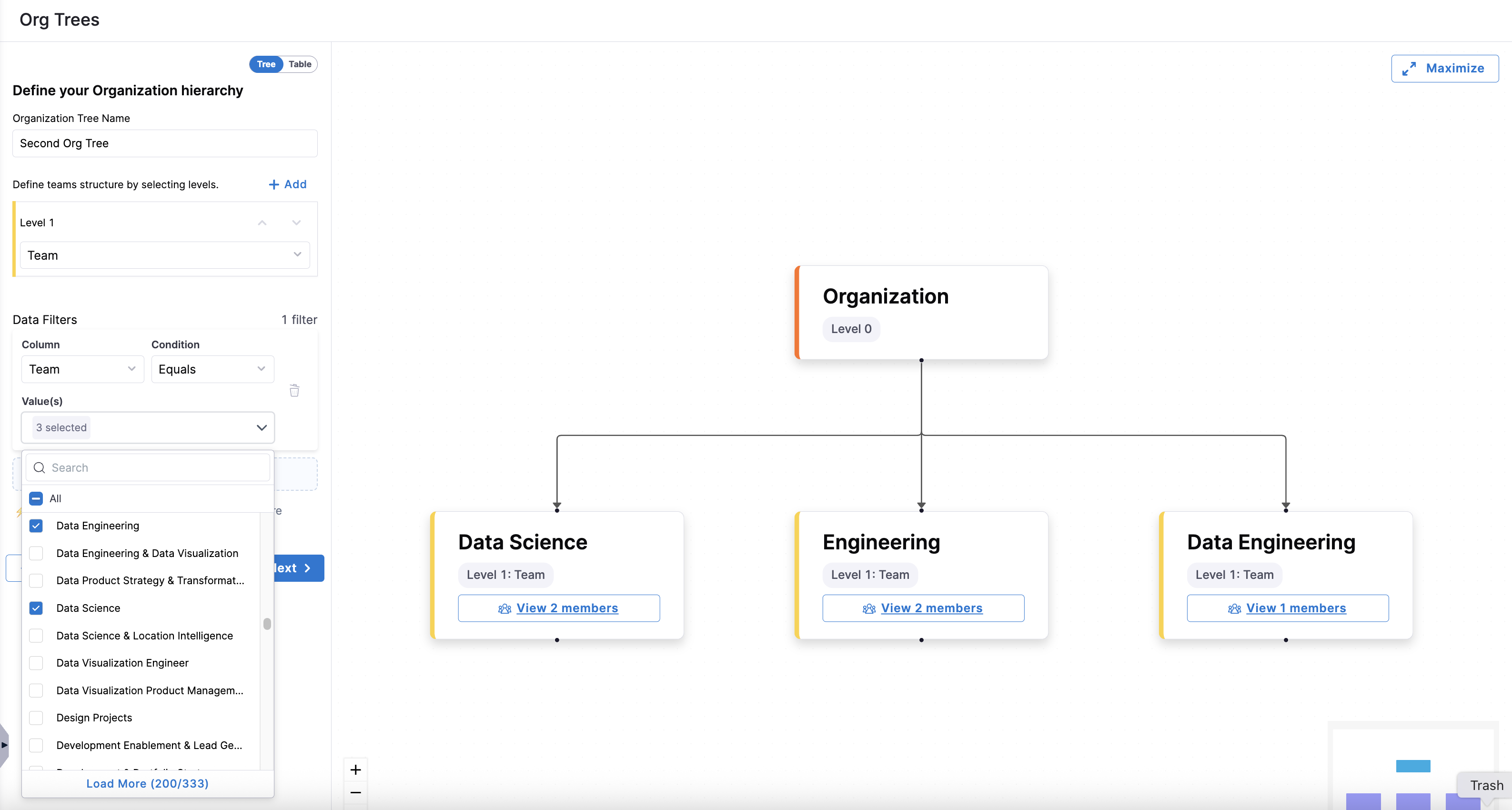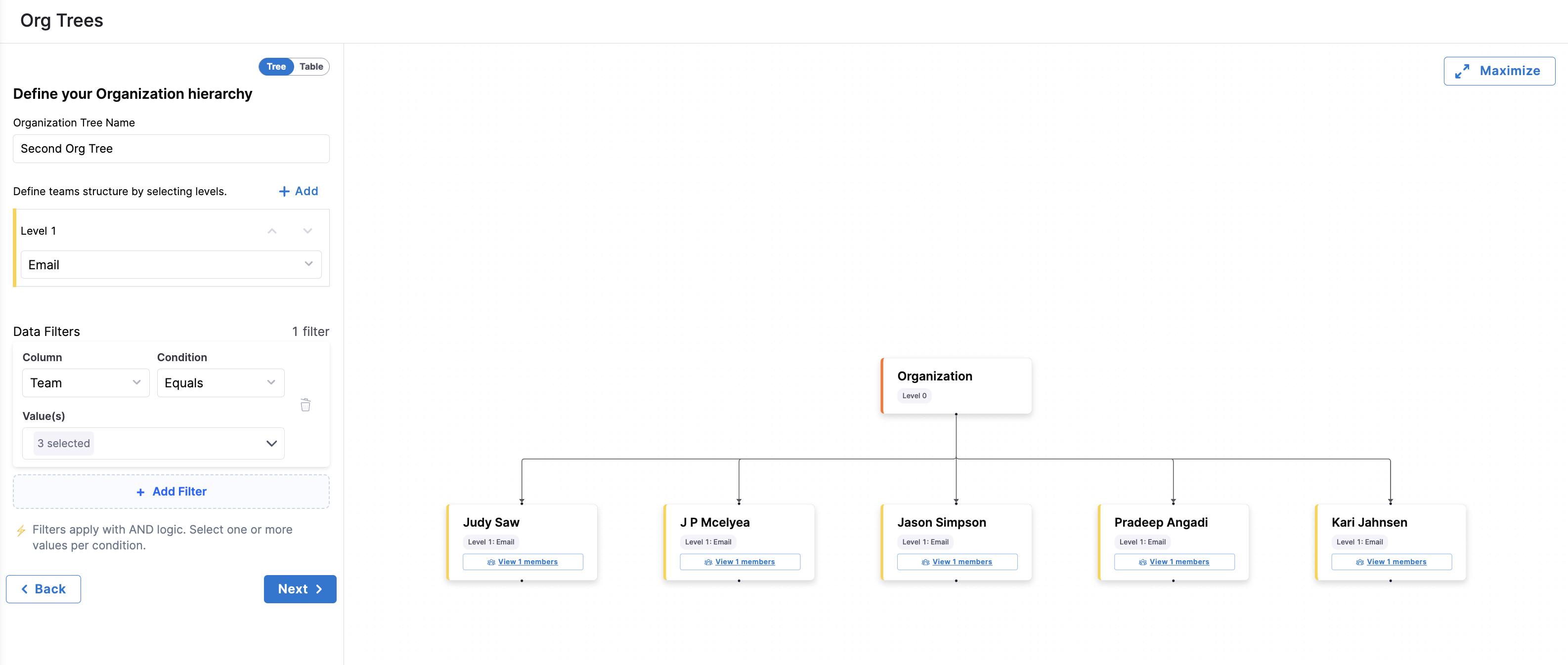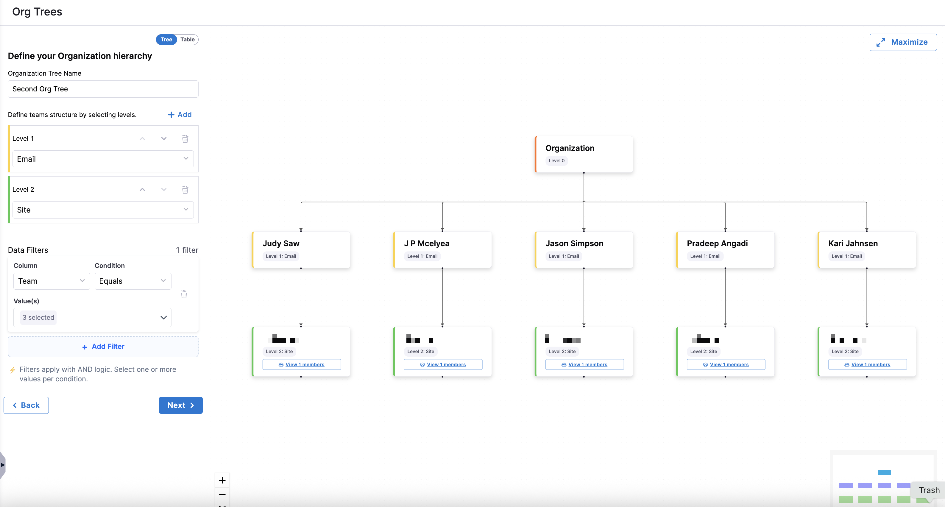 4. Define team structure by selecting levels. The Org Tree preview updates as you add levels and filters.