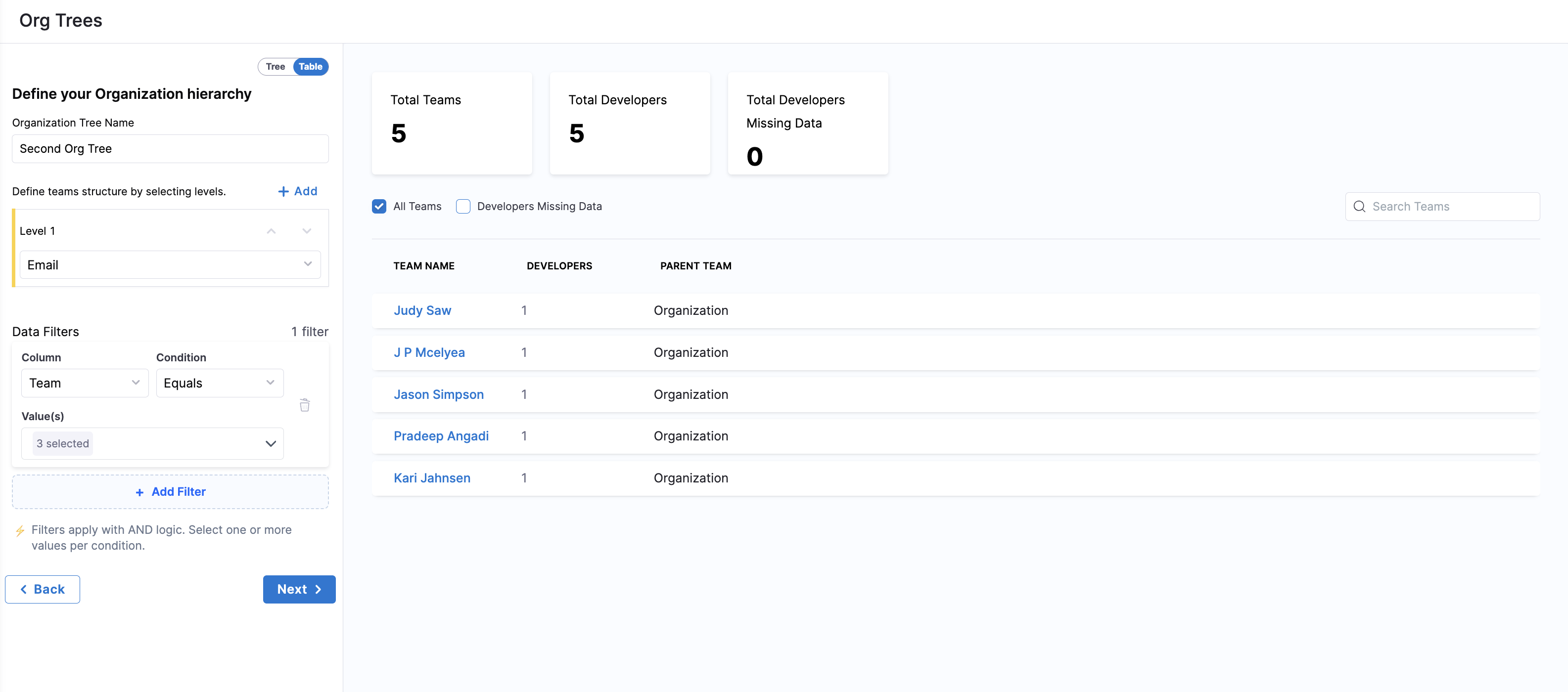 You can define multi-level hierarchies for your Org Tree in SEI 2.0. In addition to manager-reportee relationships, you can group developers by custom attributes such as Email, Manager Email, Name, Role, Site, and Team.
