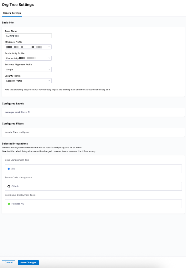 Each team in the Org Tree automatically inherits the selected profiles and default integrations. These inherited settings provide a baseline configuration that ensures metrics are calculated consistently across the organization, while still allowing teams to override specific settings when needed.