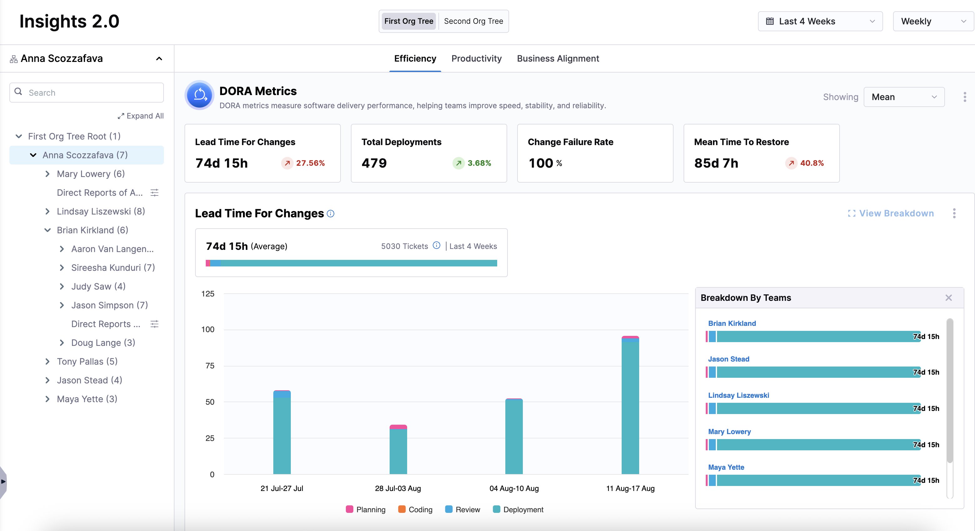 If your organization uses multiple Org Trees, you can switch between them to view insights by selecting a different Org Tree above the Efficiency, Productivity, and Business Alignment tabs.