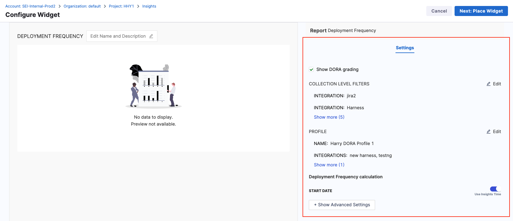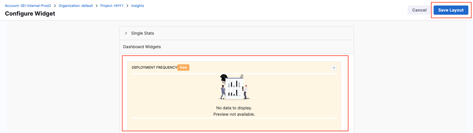 To monitor Deployment Frequency, you must create a DORA type Workflow profile and add the Deployment Frequency widget to your Insights.