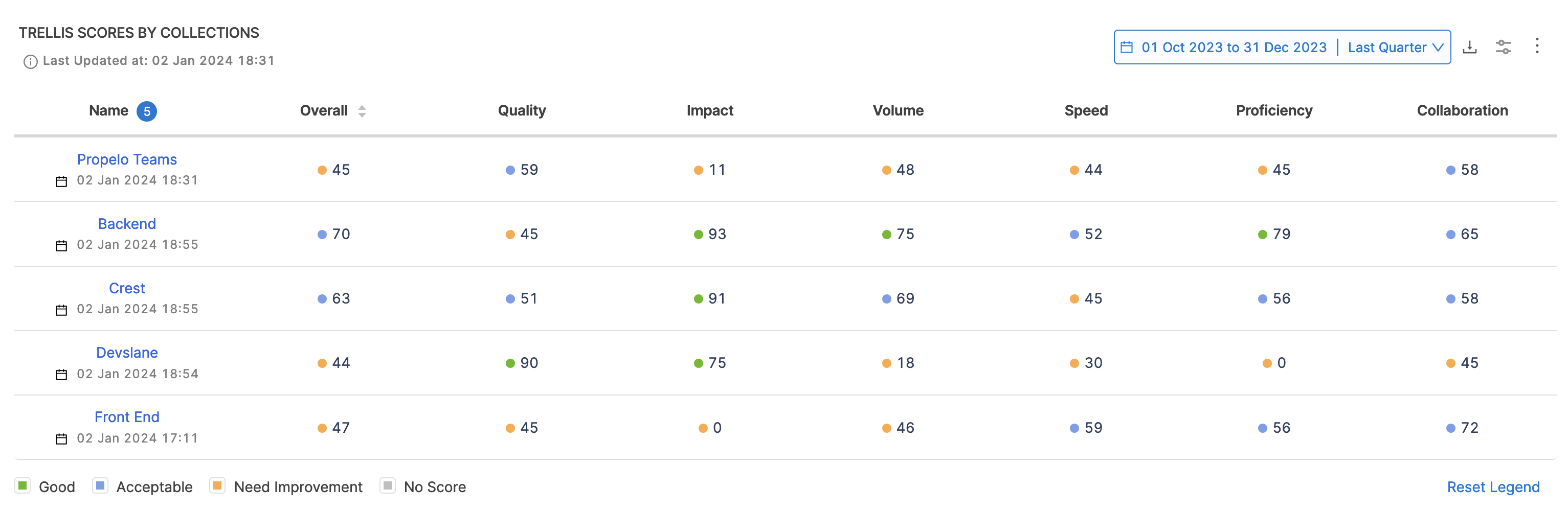 Trellis Scores are calculated from factors such as code quality, code volume, speed, impact, proficiency, and collaboration. You can adjust the weight given to each factor in the associated Trellis Profile which acts as the single source of truth for your Trellis Score calculations.