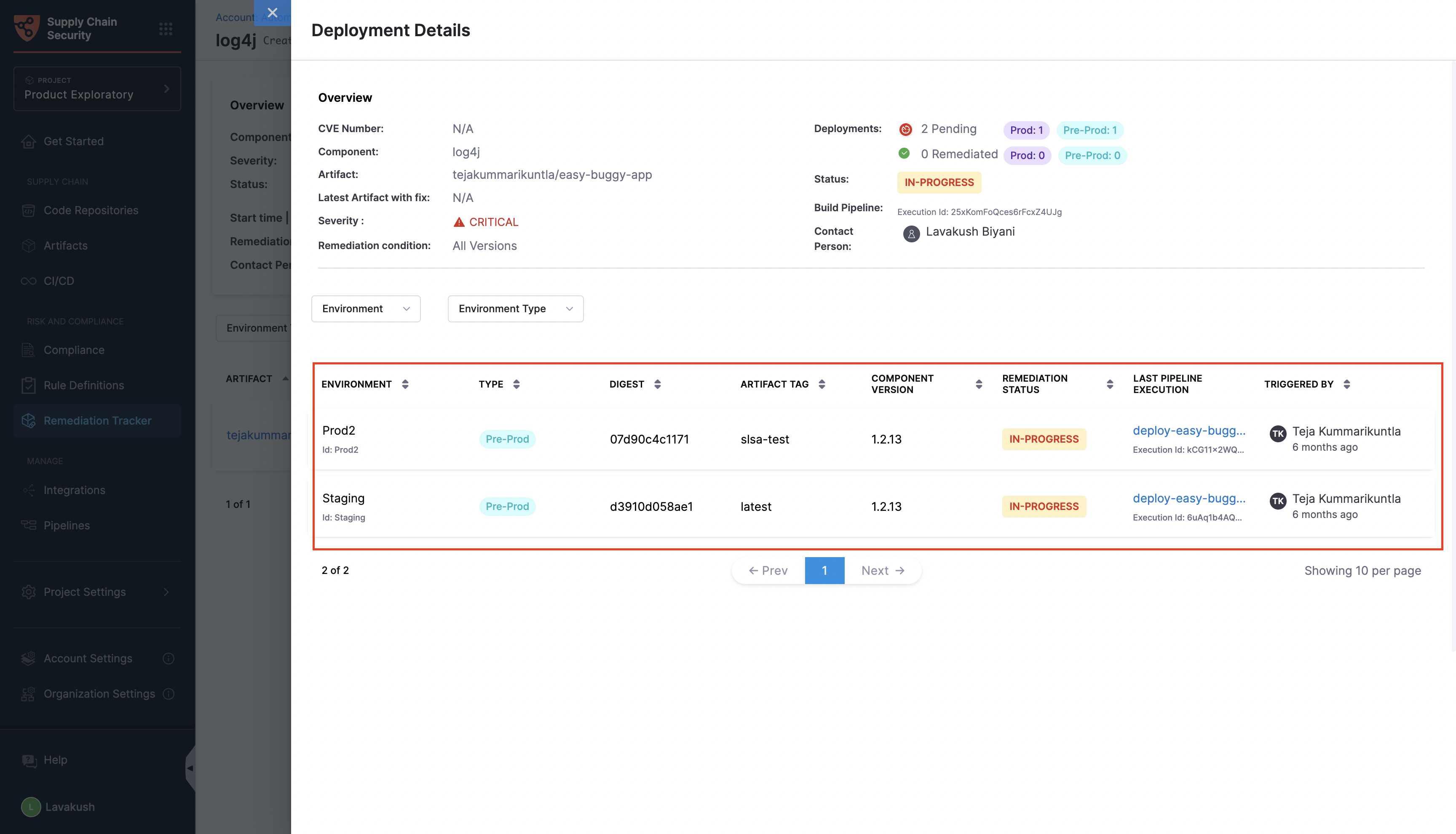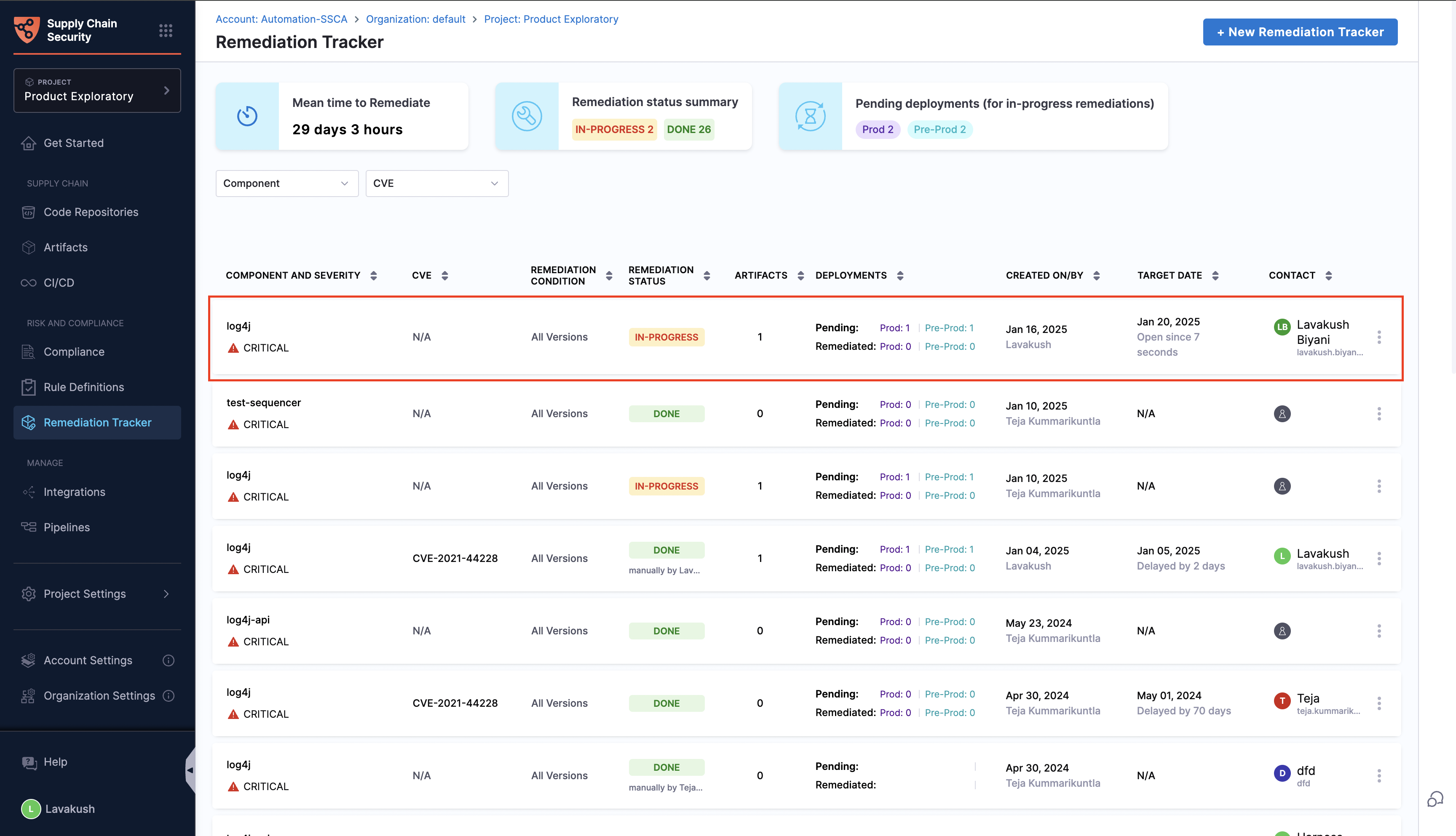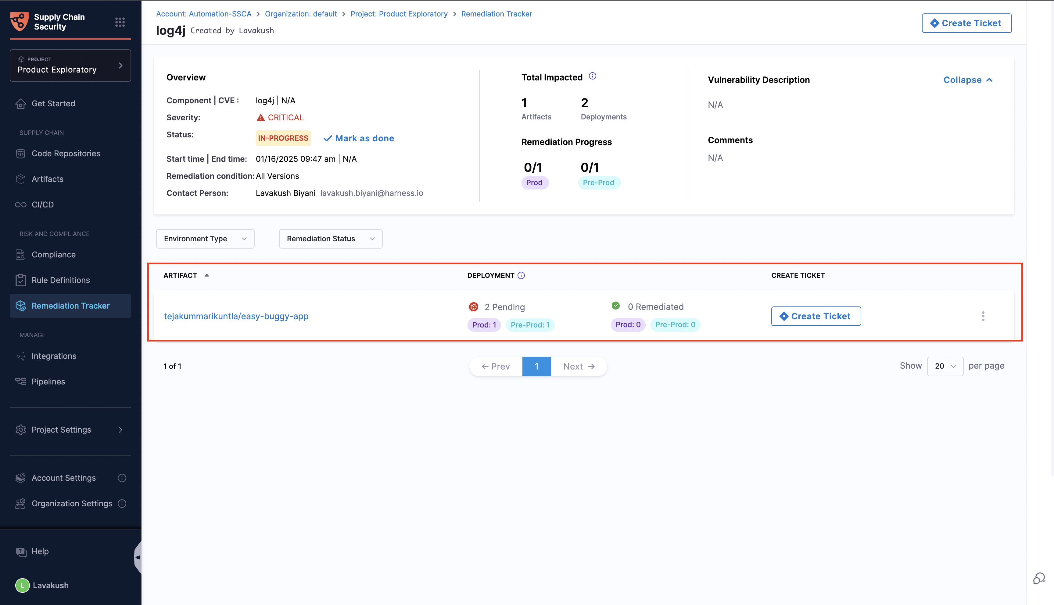 Before creating a remediation tracker, it is crucial to ensure that your deployment pipelines incorporate and successfully complete the SBOM Orchestration step. Additionally, all artifacts must be listed in the Artifacts view page in the SCS module, as the tracker can only screen through those deployed artifacts available in this view.