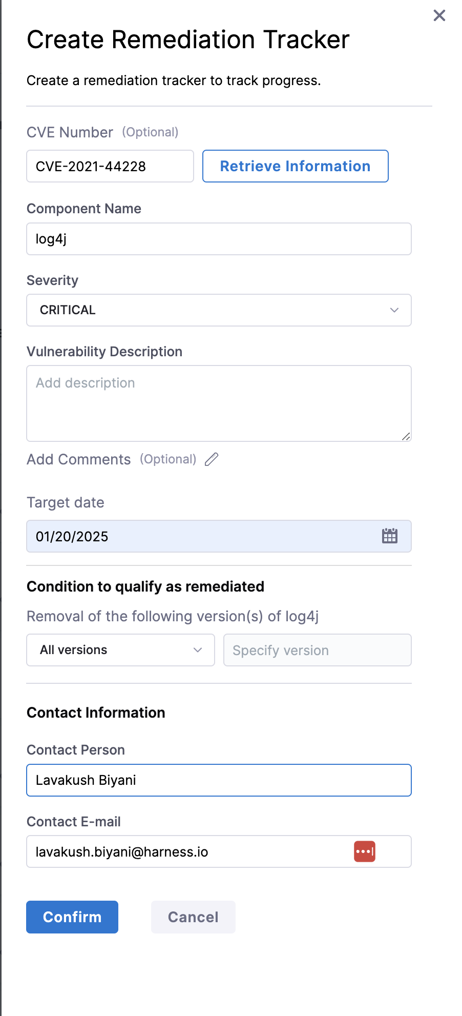 The 'Retrieve Information' button aids in fetching vulnerability data from the NVD database and automatically populates the Severity and Description fields. These fields are also editable for further customization.